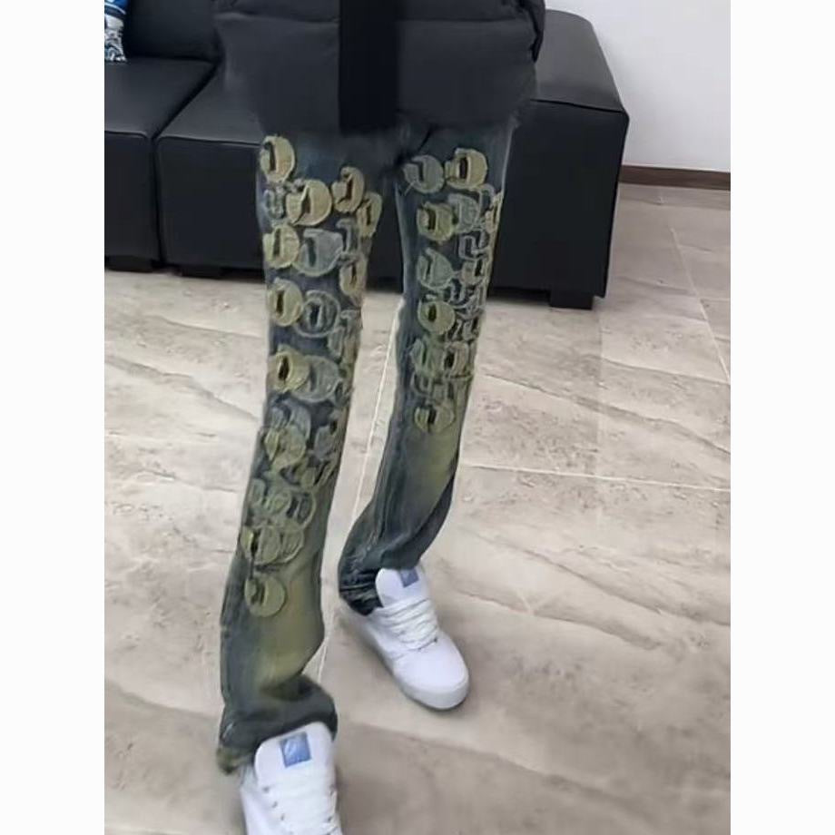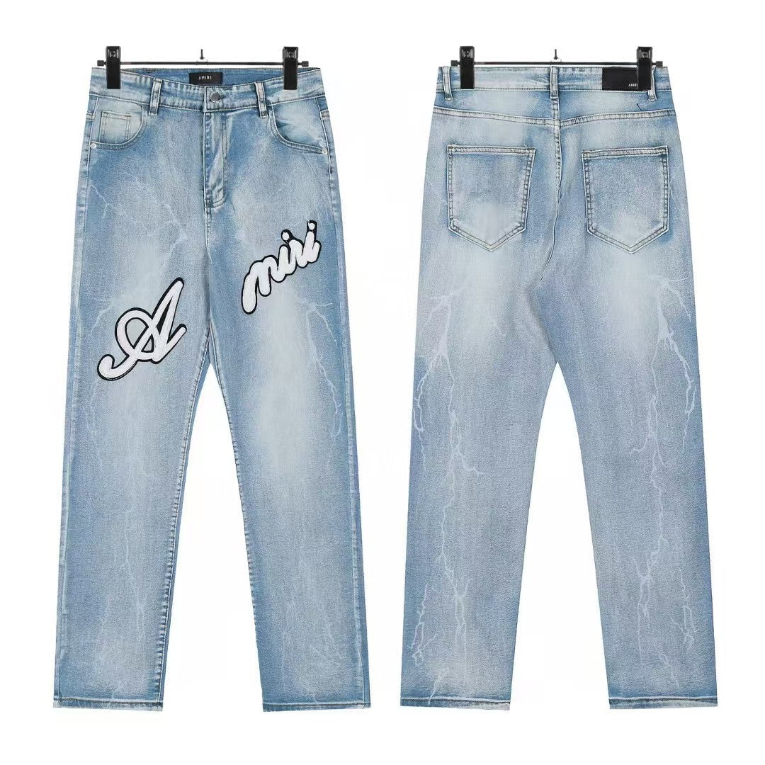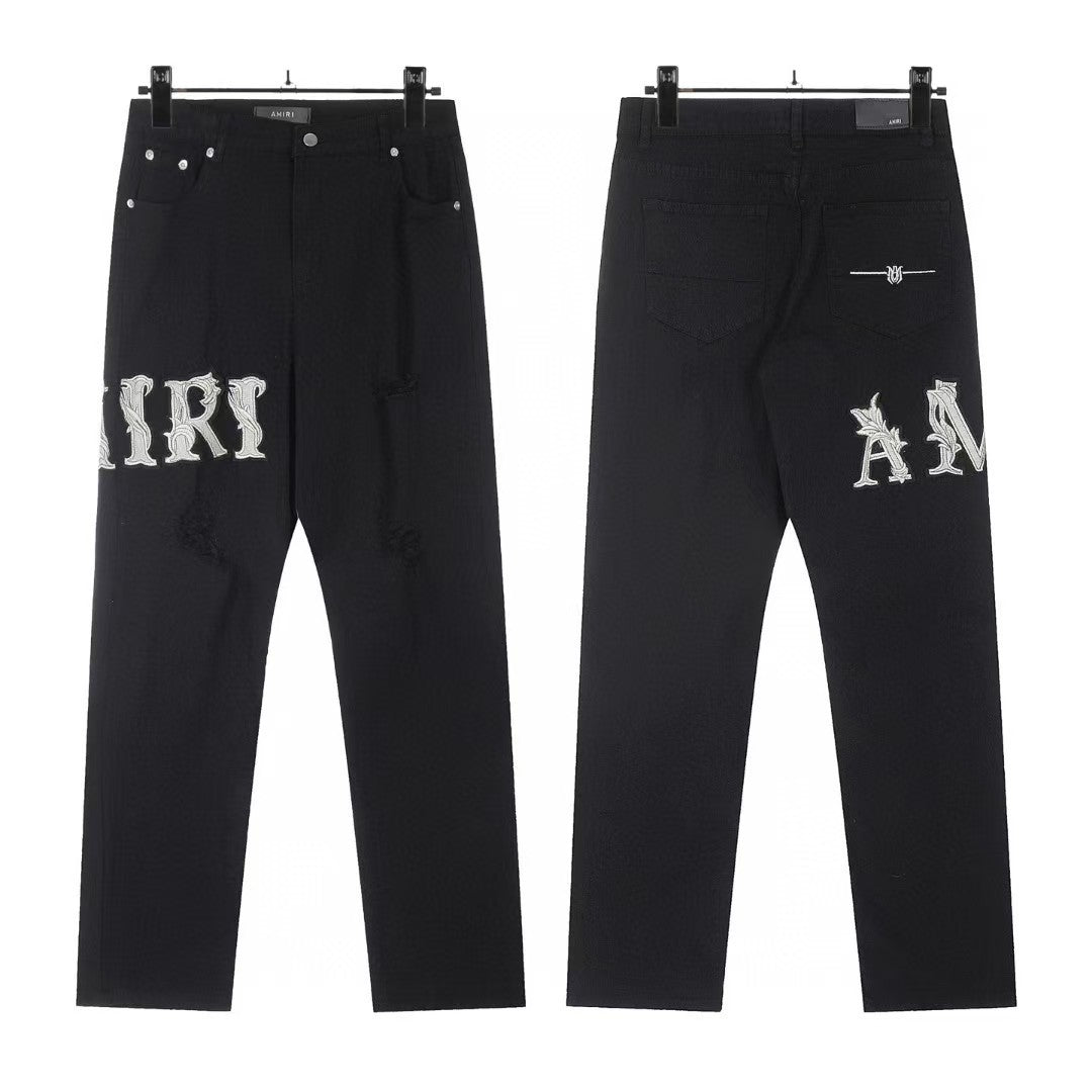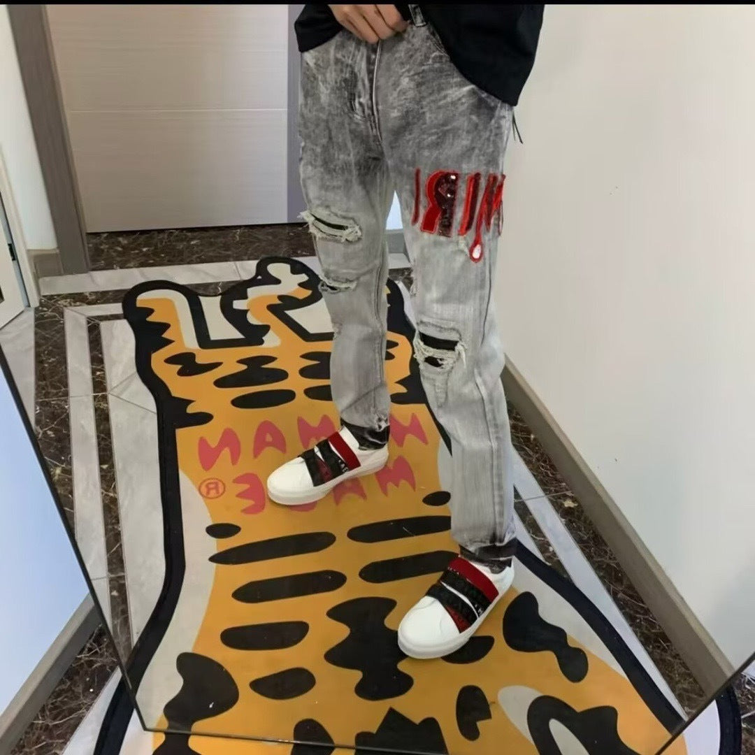 Cross-Border Foreign Trade AM American High Street Ripped Patch Letter Embroidery Washed Slim Straight Skinny Jeans Long Pants