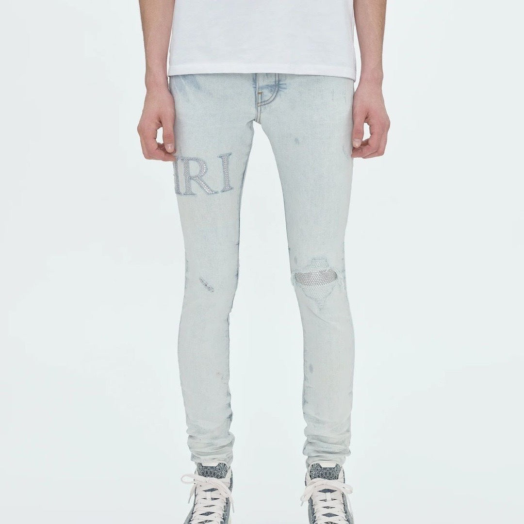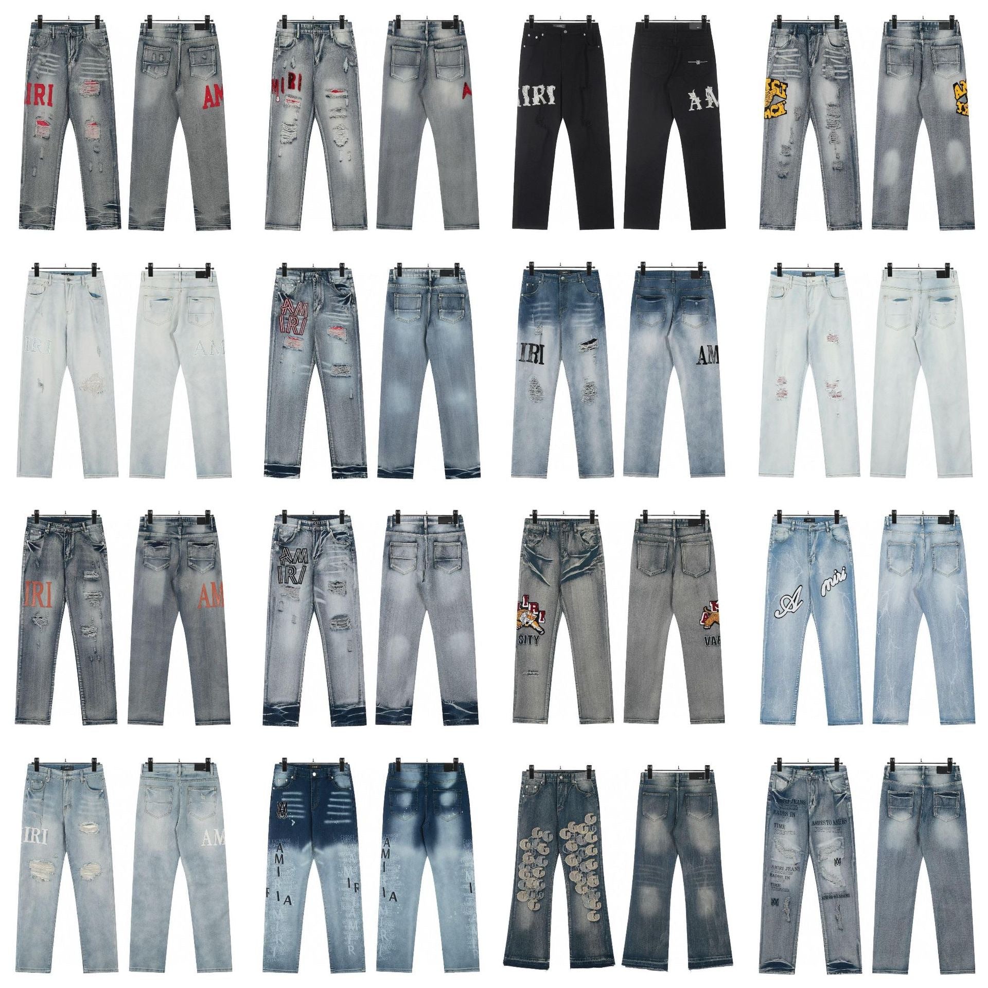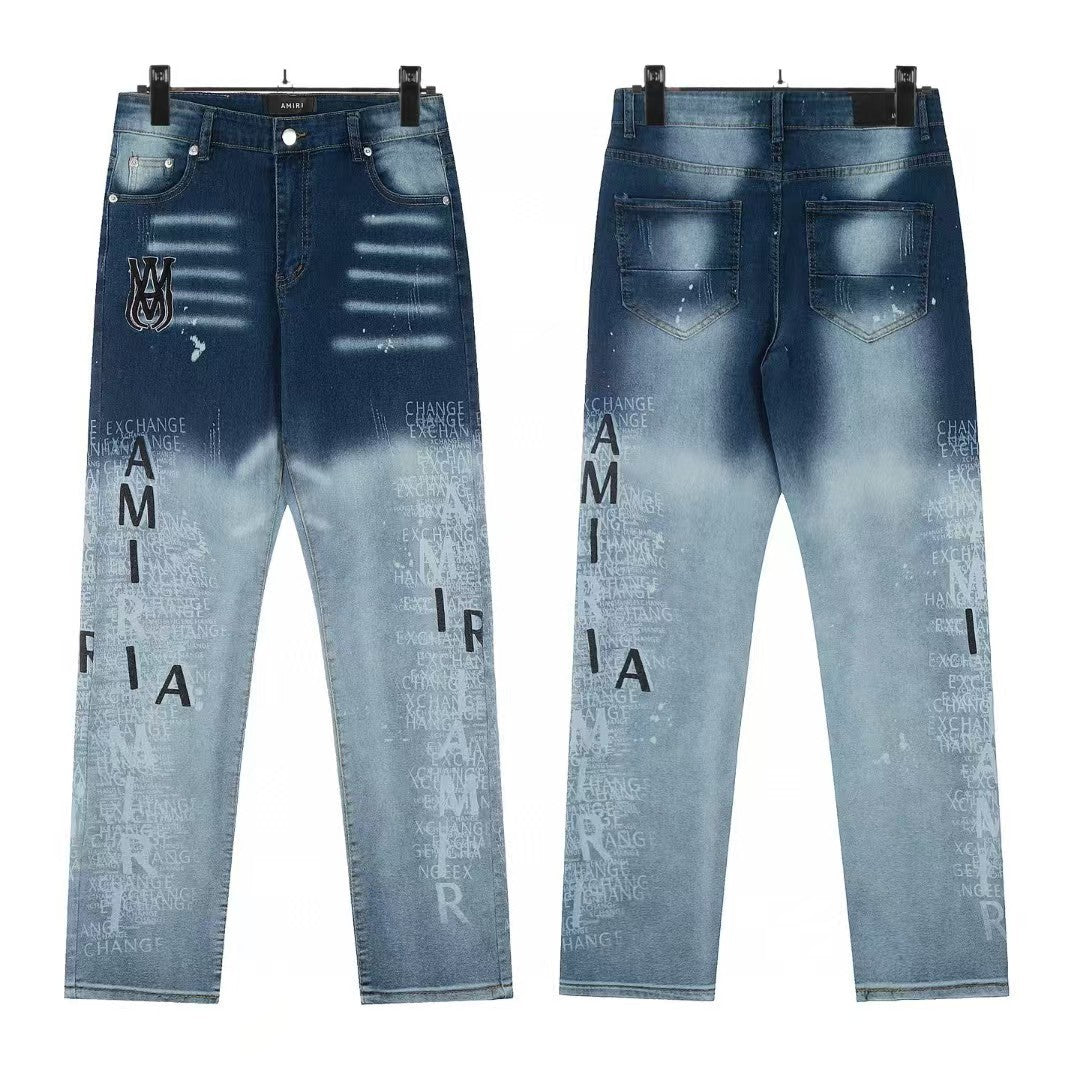 Cross-Border Foreign Trade AM American High Street Ripped Patch Letter Embroidery Washed Slim Straight Skinny Jeans Long Pants