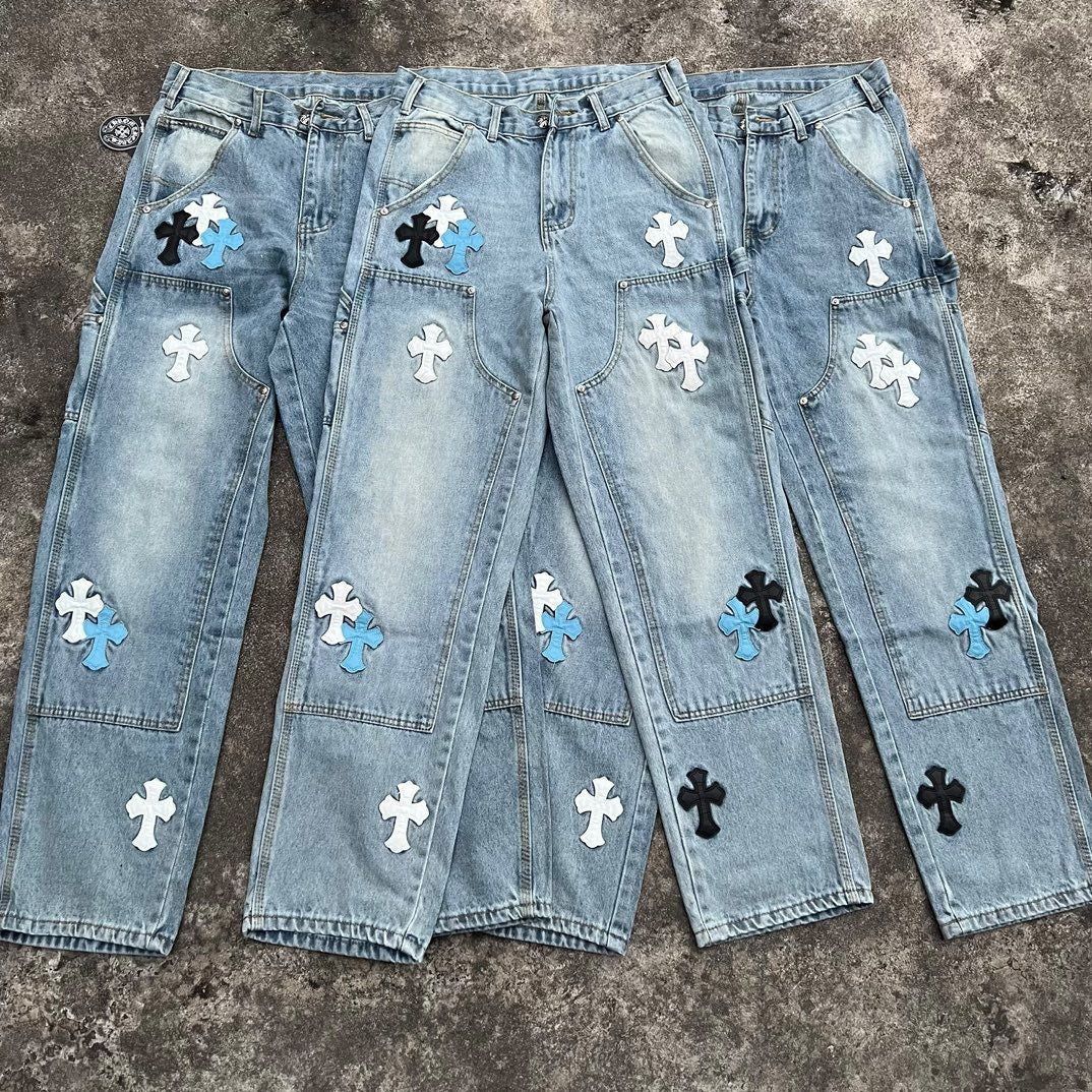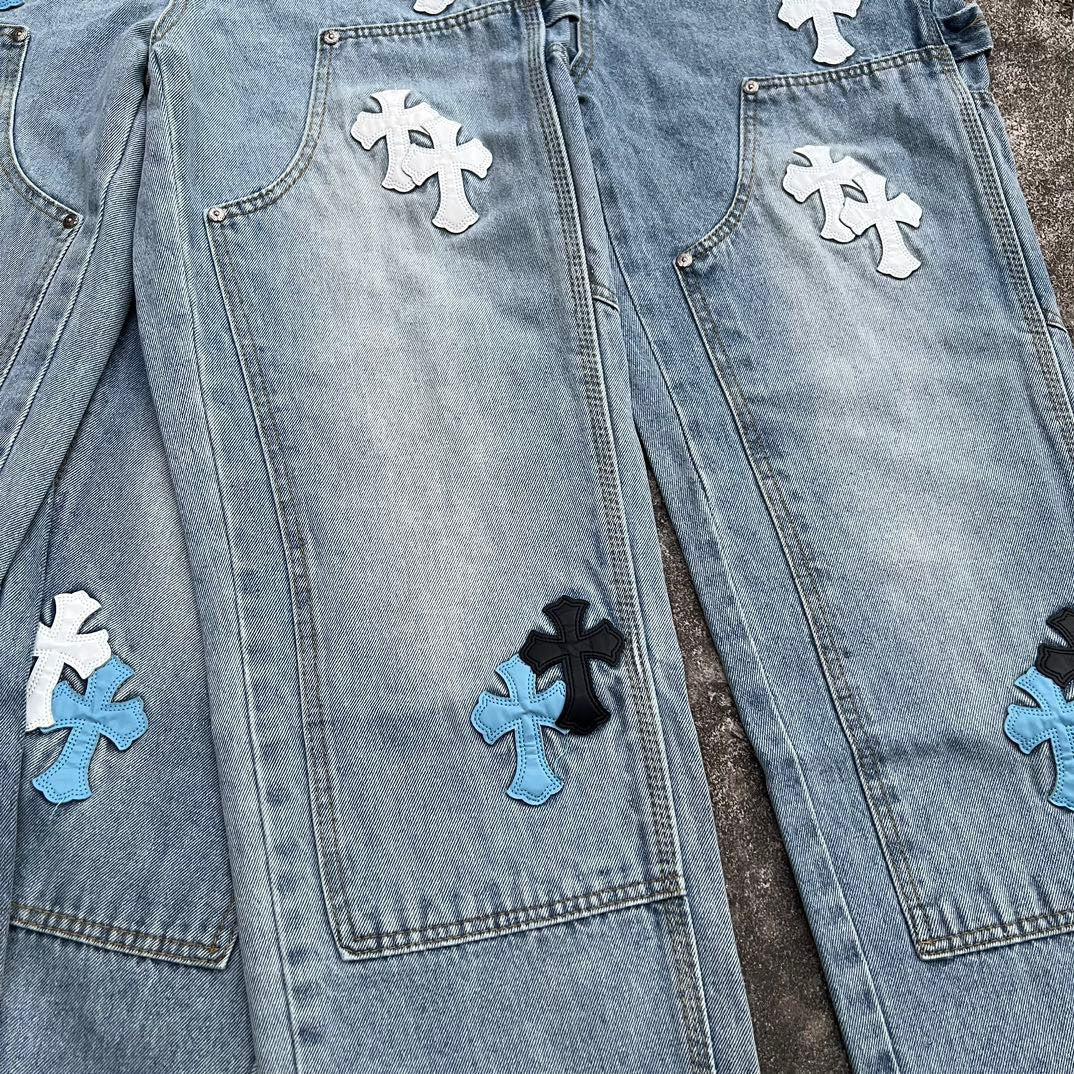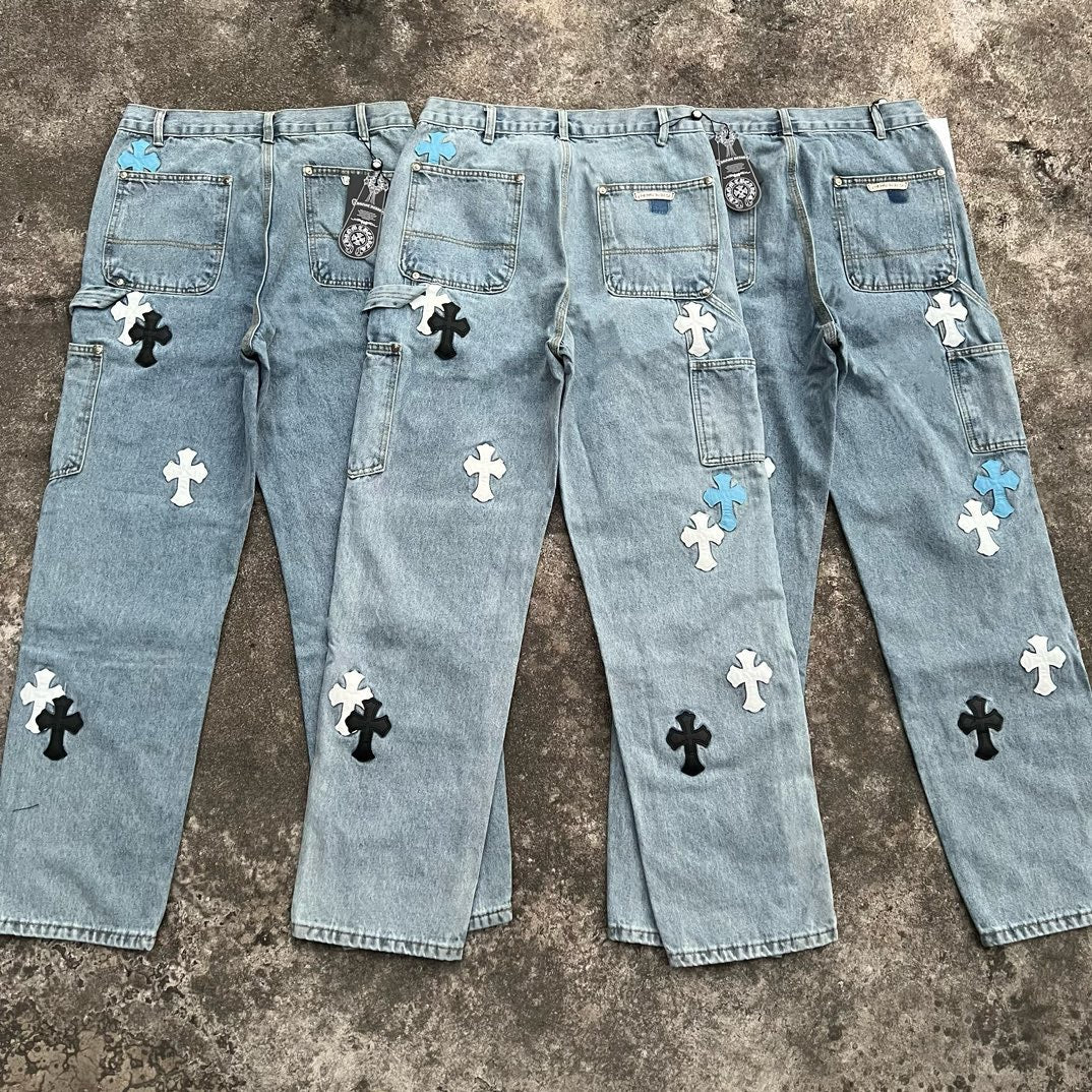 Top Heavy Industry Crafted CH Double Knee Cross Patch Leather B01 Version Logging Pants Straight Leg Sanskrit Workwear Pants High Street Jeans