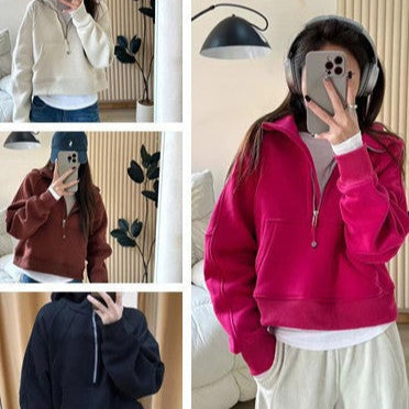 Lulu Same Style Winter Half-Zip Loose Hooded Sweatshirt for Women, Autumn and Winter Fleece-Lined Slim Fit Hoodie Jacket