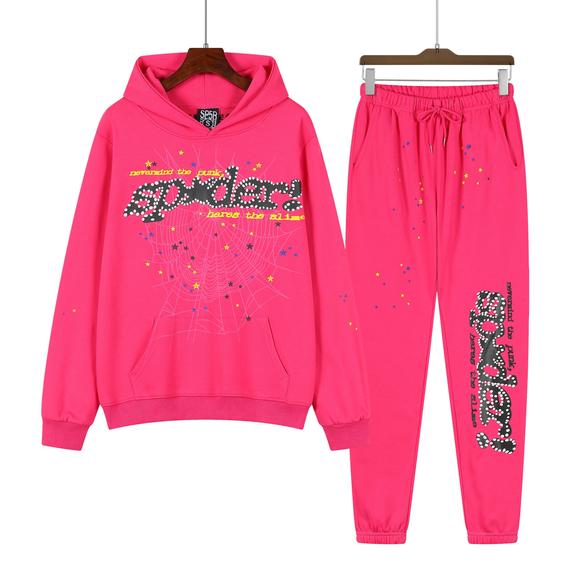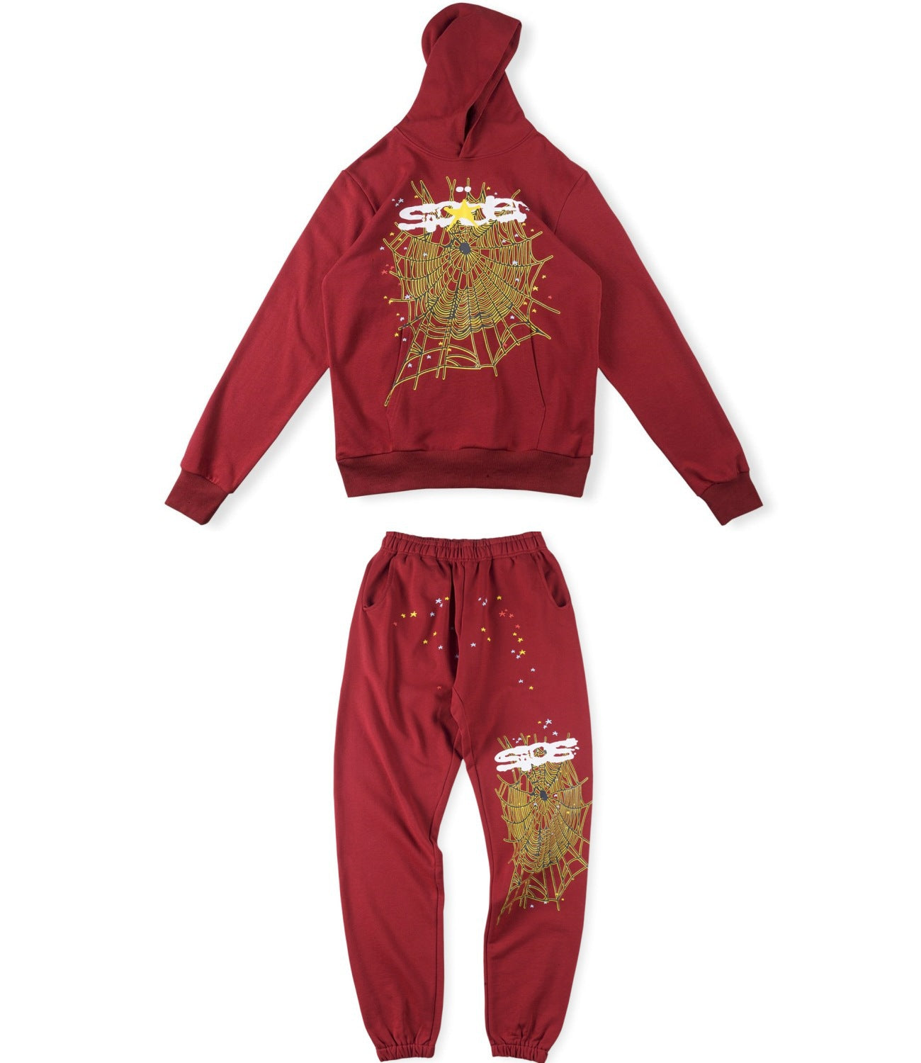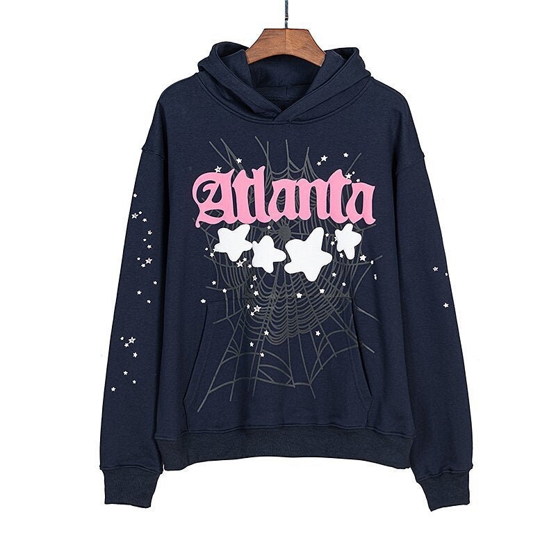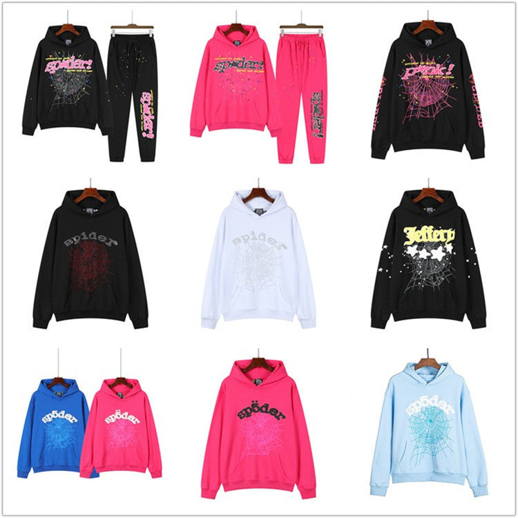 Beautiful Fashion Brand Men's and Women's Same Style 555555 Cobweb Puff Print Hip Hop Loose Heavy Terry Hooded Sweater Set(NO Fleece Lined)