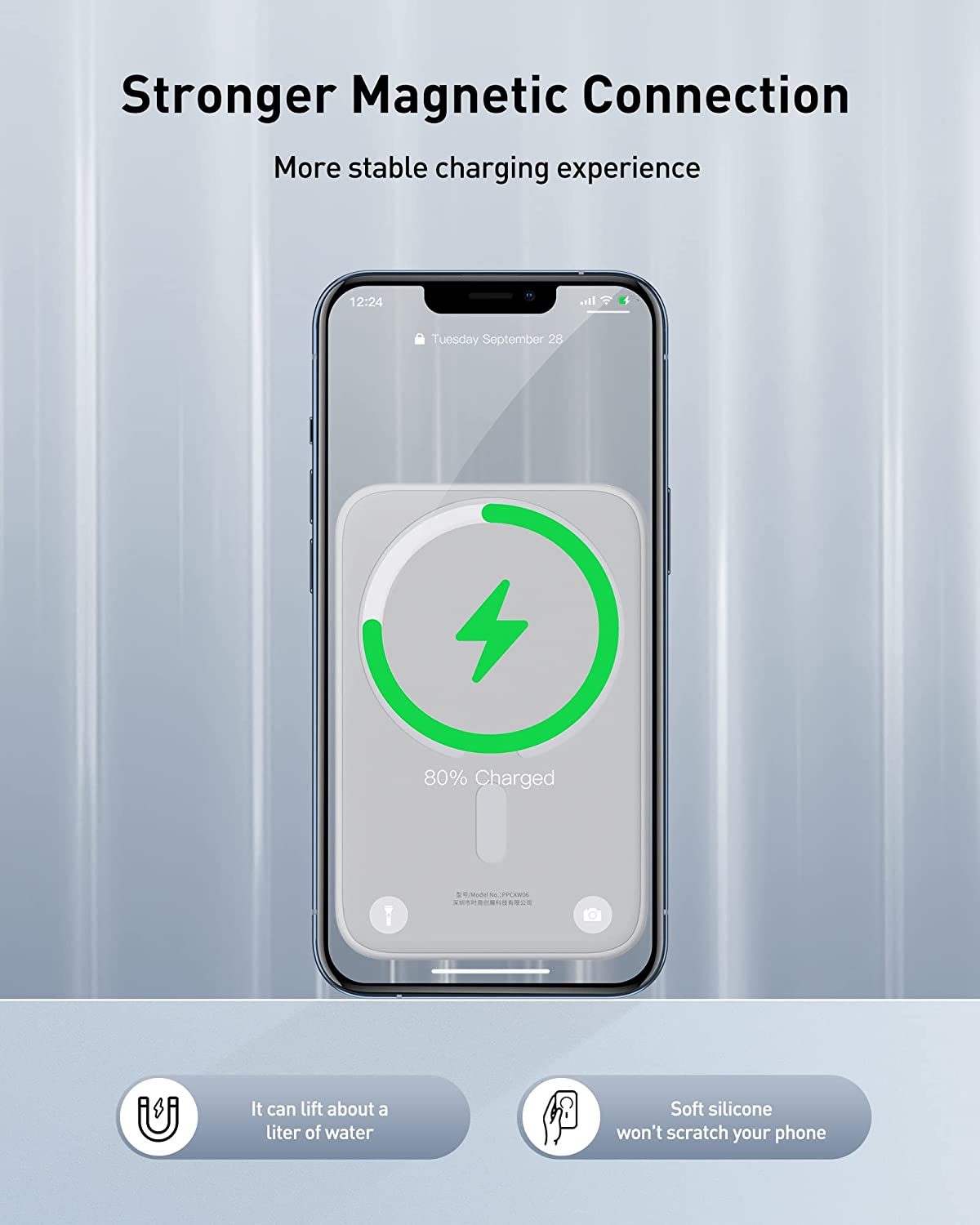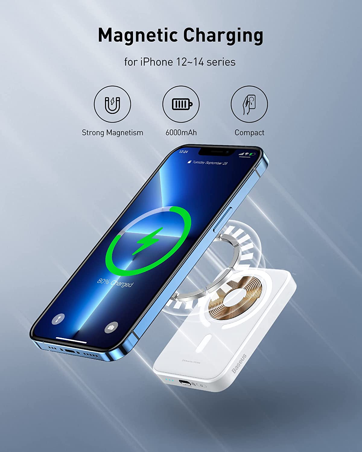 【The convenient way to charge】Just attach this magsafe compatible battery pack to your iPhone 16/15/14/13/12 Series for 7.5W magnetic wireless charging.  No more alignment problems, the built-in magnets keep the magnetic power bank in place and prevent slipping.