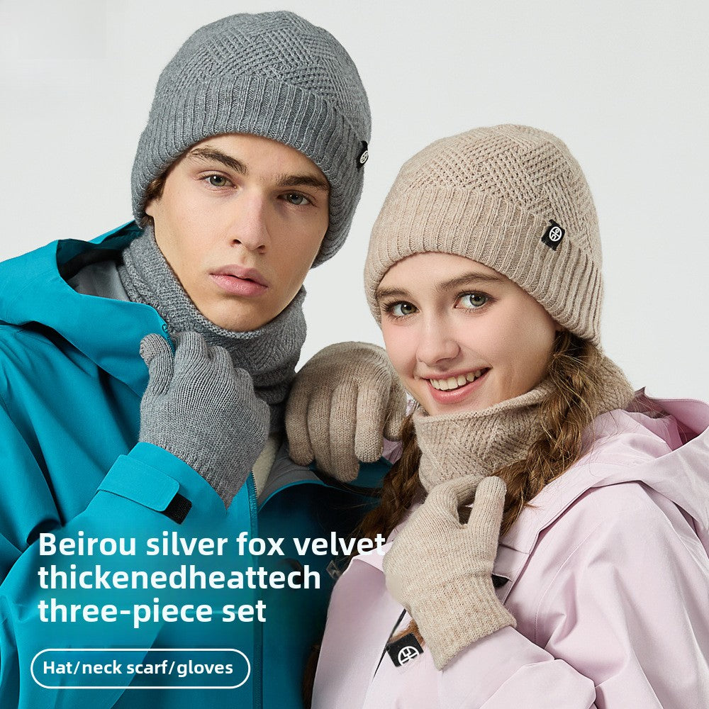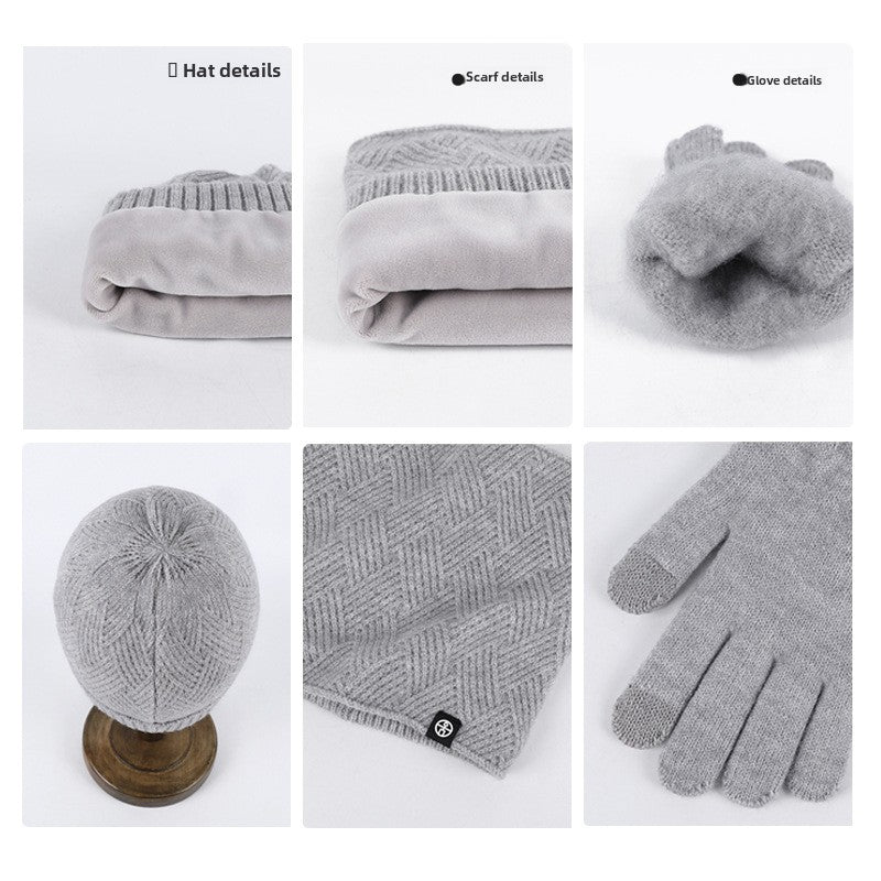 Winter neck warm three-piece hat, scarf and gloves three-piece knitted and fleece-thickened winterproof wool suit